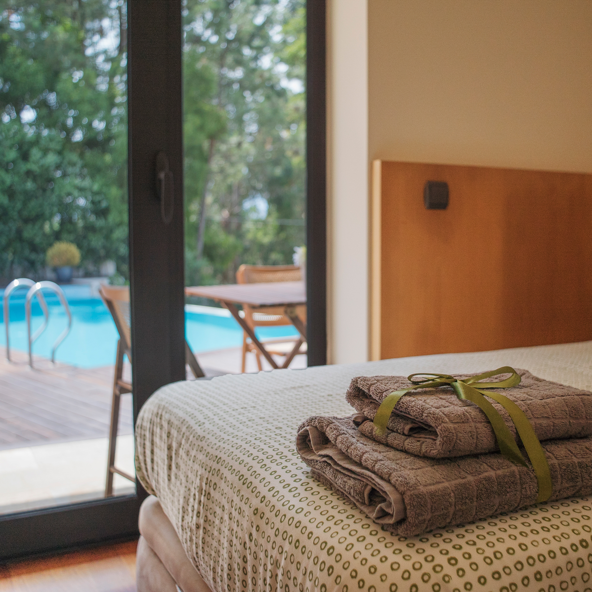 Dispomos ainda de 3 quartos (2 twin e 1 duplo) com roupeiro, casa de banho privativa e comunicação direta para a piscina.