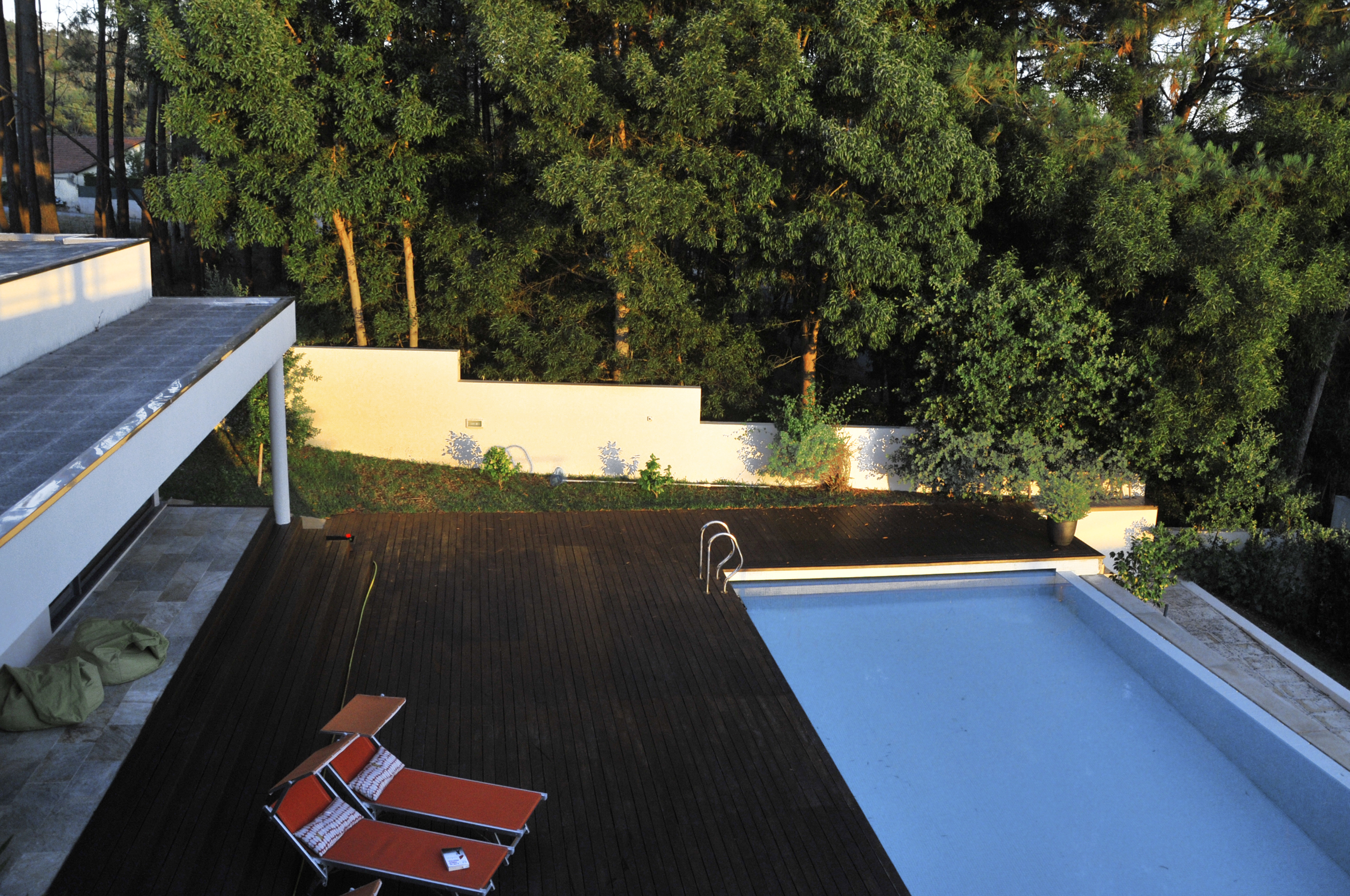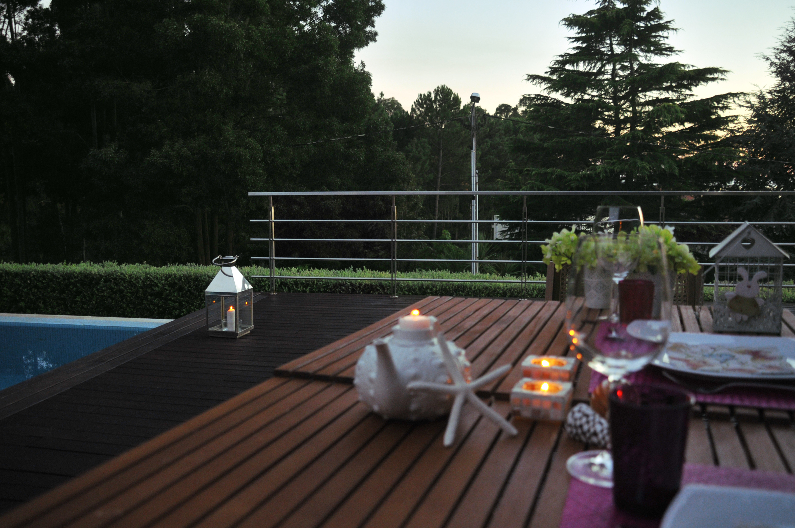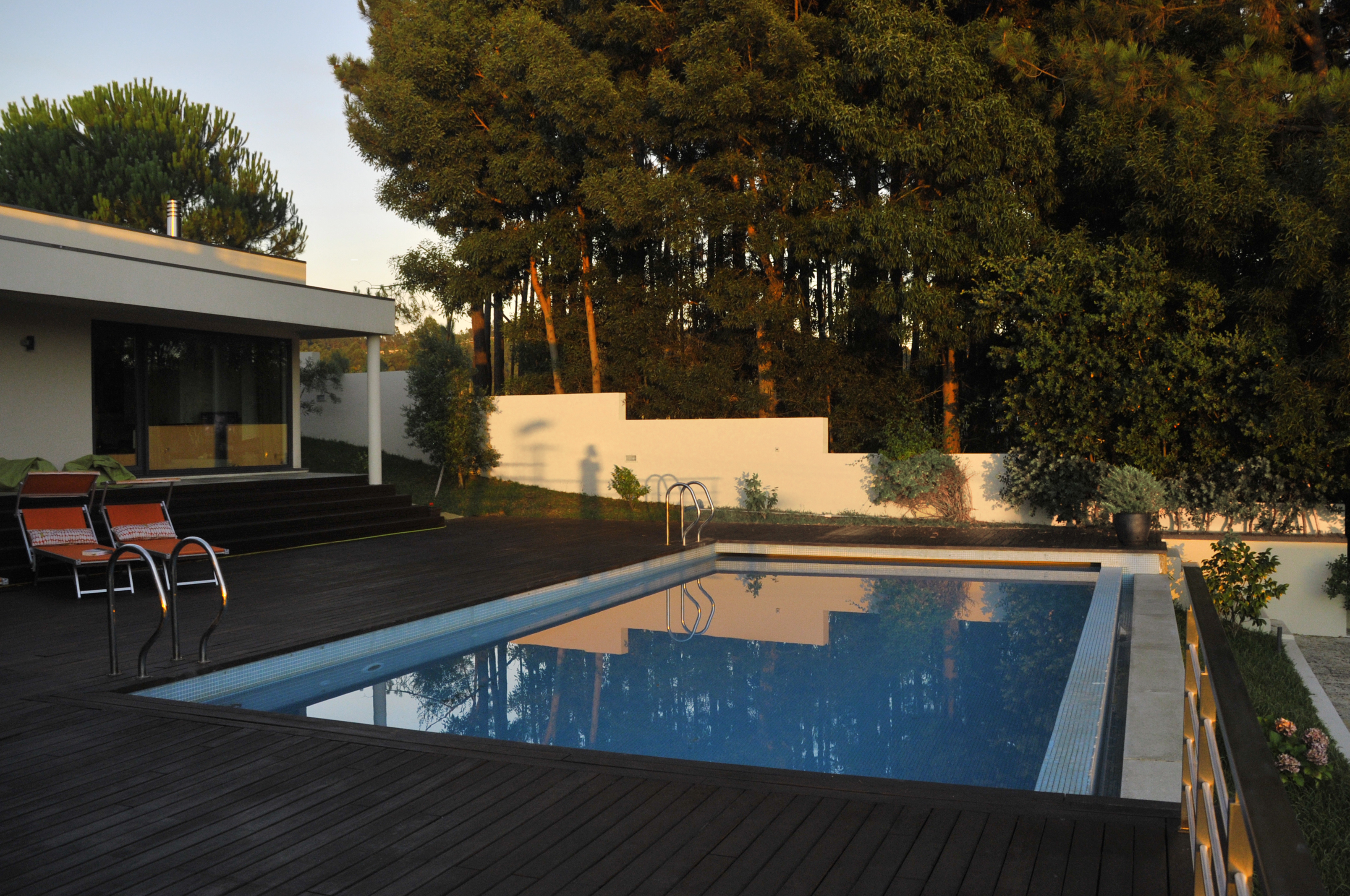O jardim, a piscina, o deck com espreguiçadeiras e mesa de refeições constituem cenário idílico para aproveitar o sol e o ar livre.